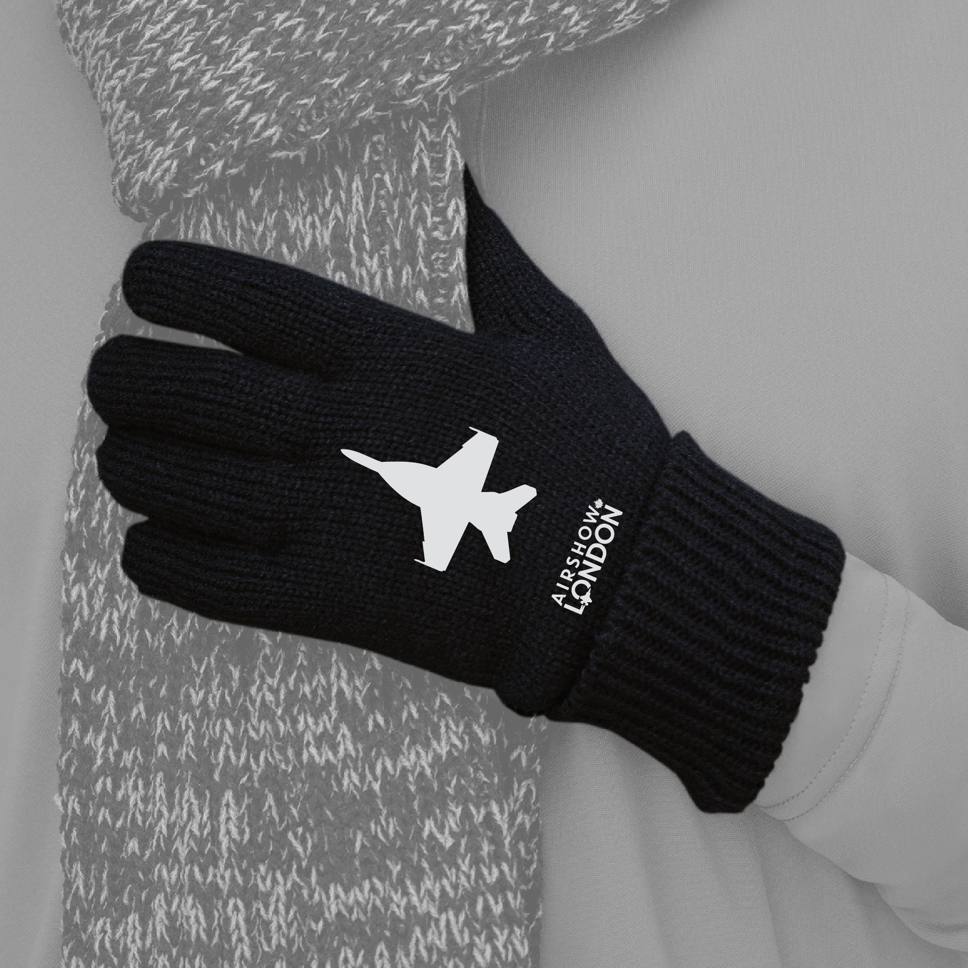 These knit gloves feature the F‑18 Hornet graphic across the hand and Airshow London branding at the cuff. Lightweight and soft with a secure fit for everyday use.