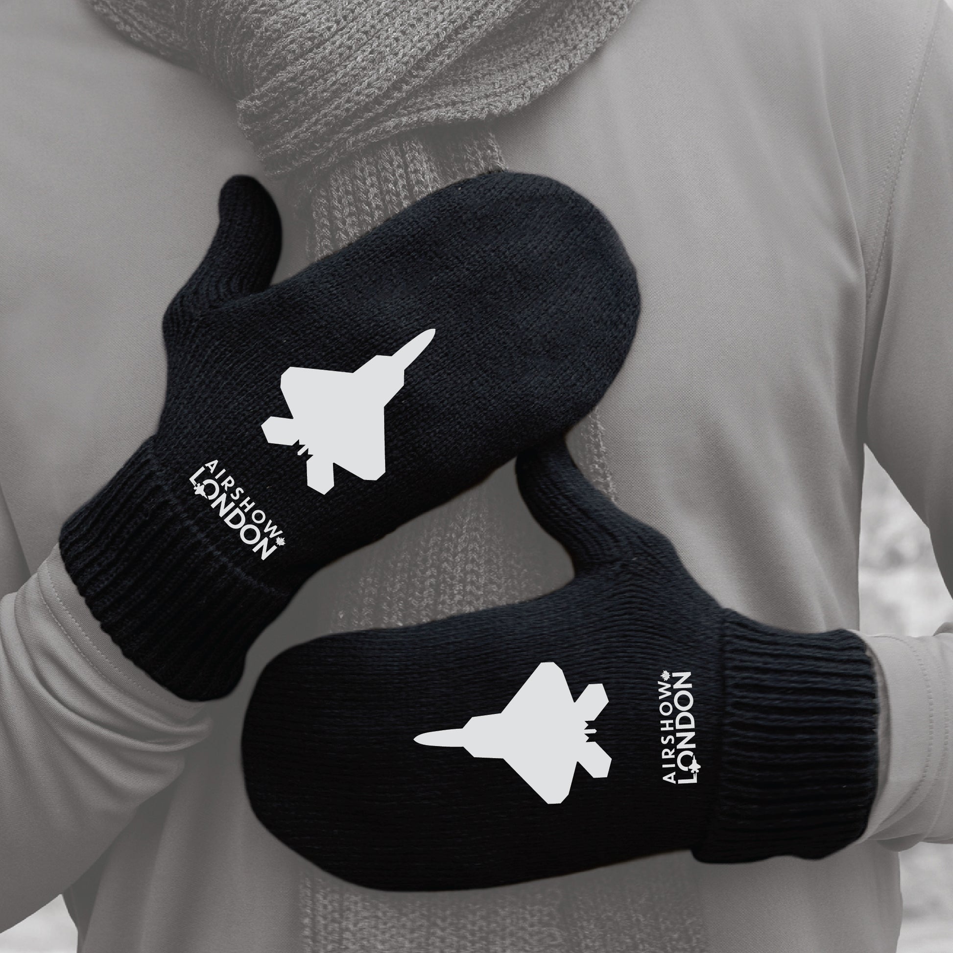 Knit mittens featuring the F‑22 Raptor and Airshow London logo in white detail. A simple, functional winter layer that keeps warmth in and cold air out.